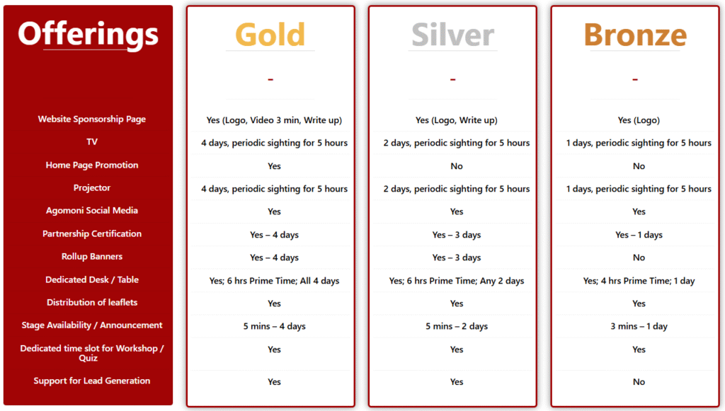 Booths, speaking slots, logo placements, digital presence